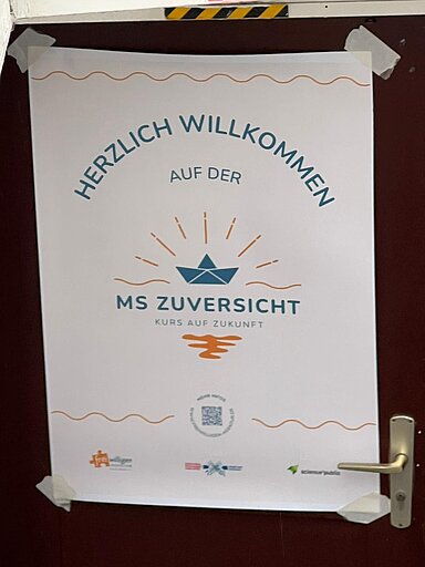 MS Zuversicht mit dem Motto "Verbindbar" auf der Make Science. Viele Teilnehmer*innen mit Fragen und andere mit Lösungen oder Ratschlägen.