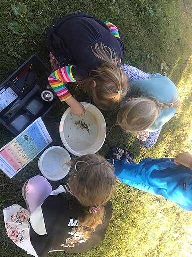 Mit Kindern aus der Riesenkleinschule wurde die Saalequalität im Wasser und an Land überprüft.