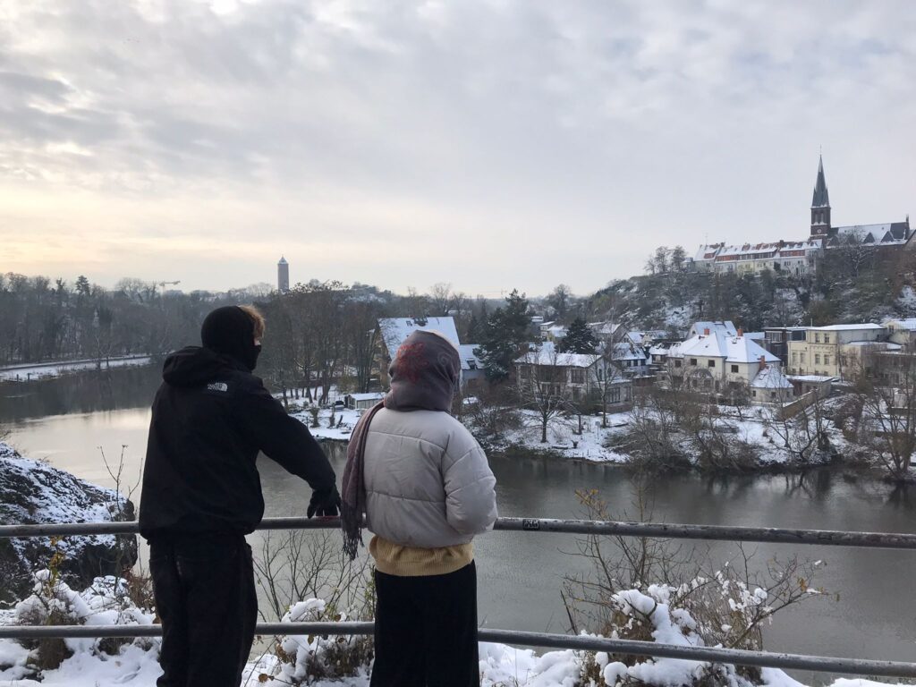Am 30.11. besuchte uns eine Gruppe Bundesfreiwilliger auf der Make Science Halle. Zu Beginn wurde den Freiwilligen über die Projekte auf dem Bürgerforschungsschiff erzählt. Gemeinsam nahmen wir dann unseren schönen Fluss, die Saale, unter die Lupe. Wir starteten mit einem Spaziergang zu den Klausbergen, wo wir die Aussicht über die Saale genossen uns ihren Lauf anschauten. Auf dem Weg zeigten wir den Freiwilligen das Mischwassersystem der Stadt und die Steinaufschüttungen entlang der Saale. Auf dem Rückweg sammelten wir ein paar Blätter und Moos vom Ufer ein und fanden mit dem Kescher sogar noch eine kleine Schnecke, die dem Winter trotze. Zurück im Warmen hatten die Freiwilligen Zeit sich bei Kaffee und Tee die Funde und unsere Algen unter dem Mikroskop anzuschauen. Bei unserem Algenquiz wurde außerdem noch fleißig gerätselt. Nach einer gemütlichen Mittagspause untersuchten wir die chemischen und physikalischen Parameter des Gewässers und werteten dann den Tag in einer kurzen Abschlussrunde aus.