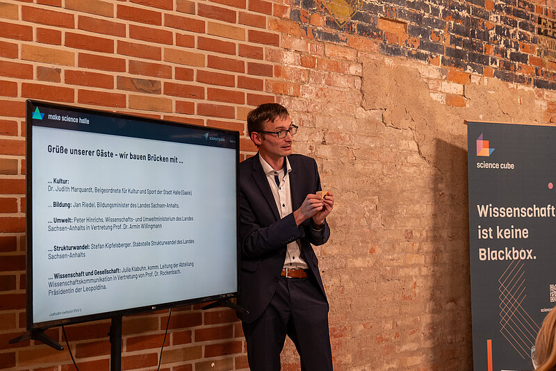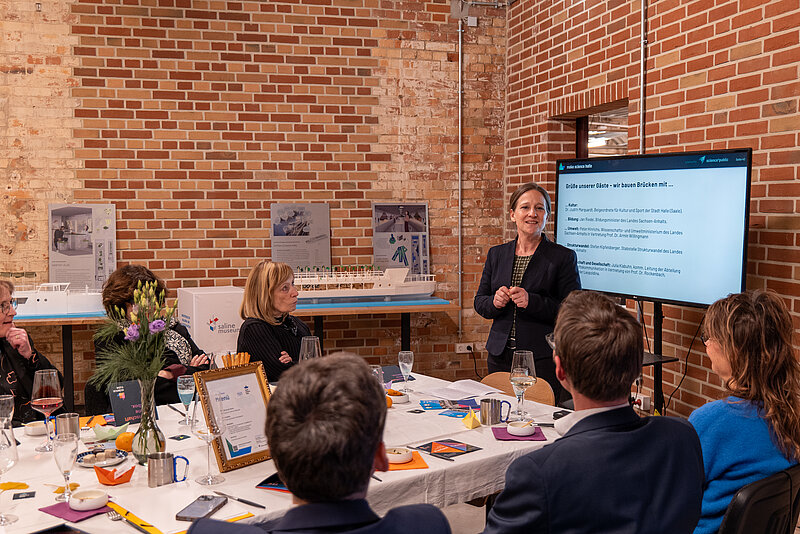 Aufgrund des Werftaufenthalts der Make Science Halle luden wir diesmal in der Saline ein. Vertreter*innen der Hochschulen des Blauen Bandes der Wissenschaft – darunter die Burg Giebichenstein Kunsthochschule Halle, die Hochschule Merseburg, die Hochschule Anhalt, die Otto-von-Guericke-Universität Magdeburg, die Hochschule Magdeburg-Stendal sowie die Martin-Luther-Universität Halle-Wittenberg – trafen dort auf Akteur*innen aus der Stadt Halle (Saale), dem Land Sachsen-Anhalt sowie weitere Partner*innen und Förder*innen. Gemeinsam tauschten sie sich zu Fragen von Wissenschaft, Gesellschaft und Zukunft aus, nahmen neue Impulse mit und vertieften bestehende wie neue Verbindungen.