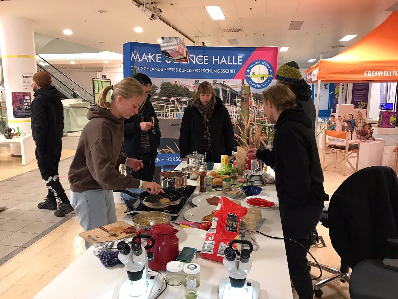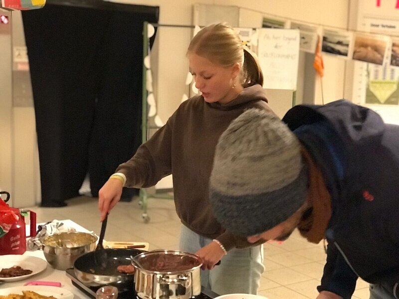 Am 02.12.2023 boten wir im KulturKaufhaus einen Kochworkshop zum Thema „Ernährung der Zukunft“ an. Gemeinsam wurden aus geretteten Lebensmitteln Burger zubereitet. Zum Vergleich gab es Burger Patties aus Linsen und Roter Beete. Wer sich traute konnte zudem Patties probieren, die statt herkömmlichen Mehl Mehlwurmmehl enthielten. Der Vorteil von Mehlwürmern besteht darin, dass sie einen hohen Proteinanteil besitzen, zu 100 % verwertbar sind und die Mehlwurmzucht im Vergleich zu konventioneller Massentierhaltung sehr wenig Platz und Wasser verbraucht.