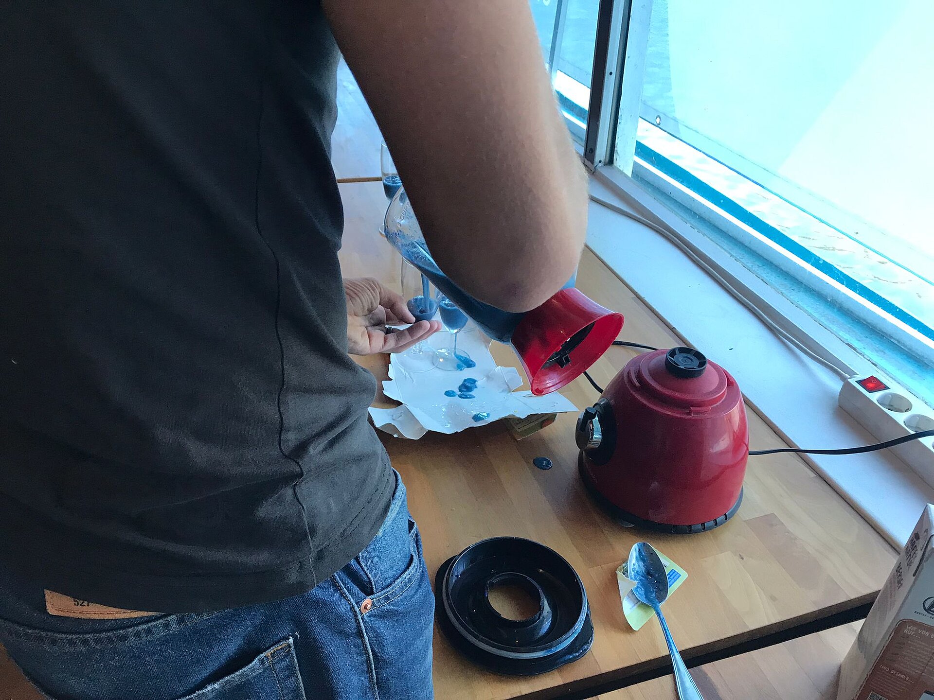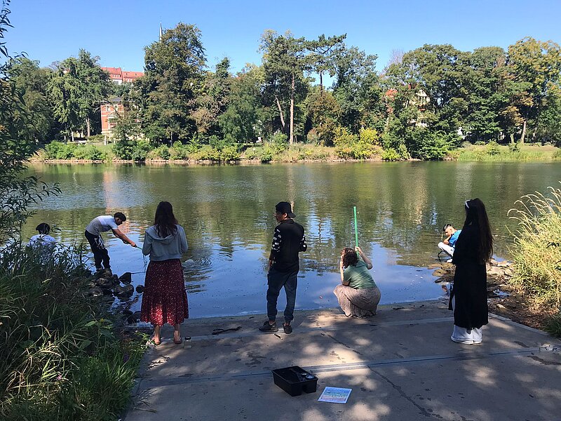 Am ersten Tag stand die Erkundung des Gewässers im Vordergrund. Die Gruppe beschäftigte sich mit dem Keschern und Mikroskopieren, zeichnete und bestimmte die gefundenen Organismen und zog daraus Rückschlüsse auf die Wasserqualität. Parallel dazu befasste sich die andere Hälfte der Teilnehmenden mit der Untersuchung chemischer Parameter.