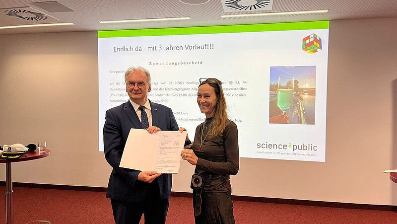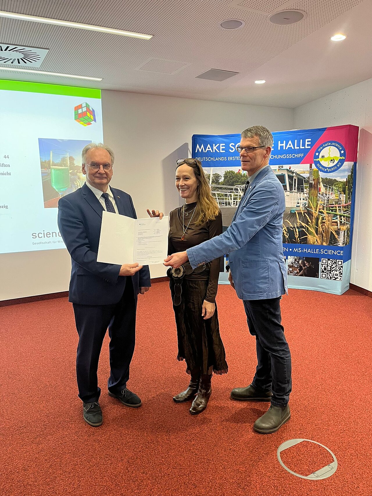 Wir haben es geschafft! Heute, am 06.12.23, haben wir den Förderbescheid für das Projekt „Wissenschaftskubus für (H)ALLE“ von Ministerpräsident Dr. Reiner Haseloff übergeben bekommen.