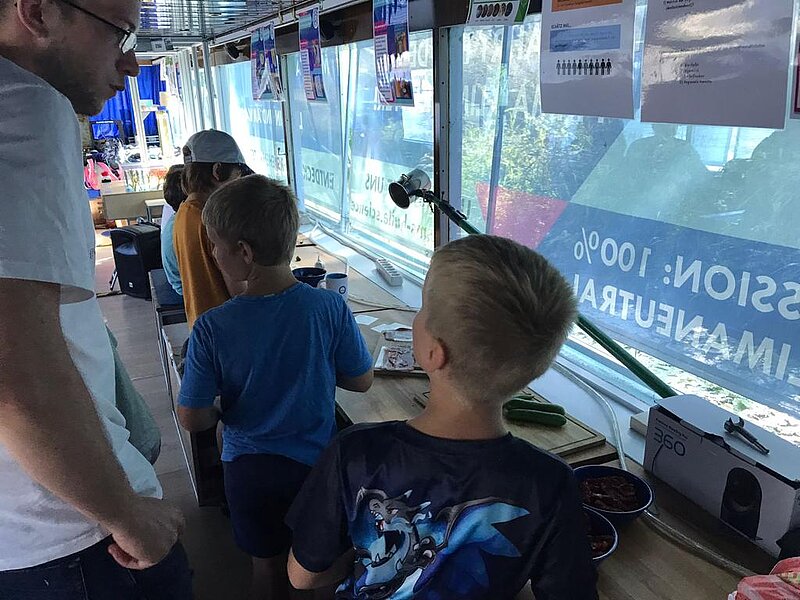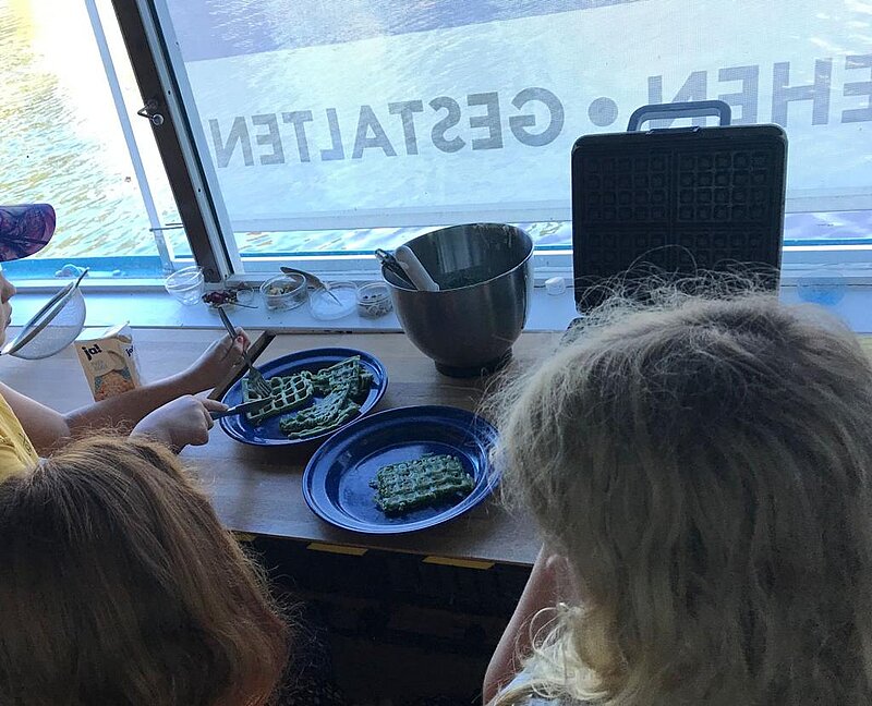 Am 14.08. besuchte uns der Hort Wittekind mit 32 Kindern zum Ende der Sommerferien. Unsere Praktikanten der MLU, Adrian und Nicolas, hatten für die Gruppe ein Programm vorbereitet. Nach einer kurzen Einführung zum Thema Kläranlagen konnte eine Gruppe sich dann mit Adrian ein Miniklärwerk bauen und schmutziges Wasser filtern. Die andere Hälfte bereitete im Schiff ein leckeres Frühstück zu mit Nicolas. Nebenbei konnten ein paar Kinder noch mit Hanna in der Kombüse Algenwaffeln herstellen, die anschließend an alle verteilt wurden. Nachdem die Gruppen getauscht hatten, wurde der Projekttag noch kurz ausgewertet und die Kinder verabschiedet.