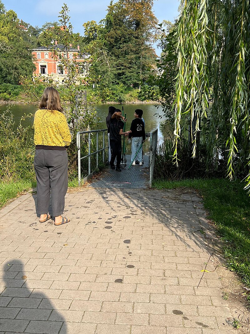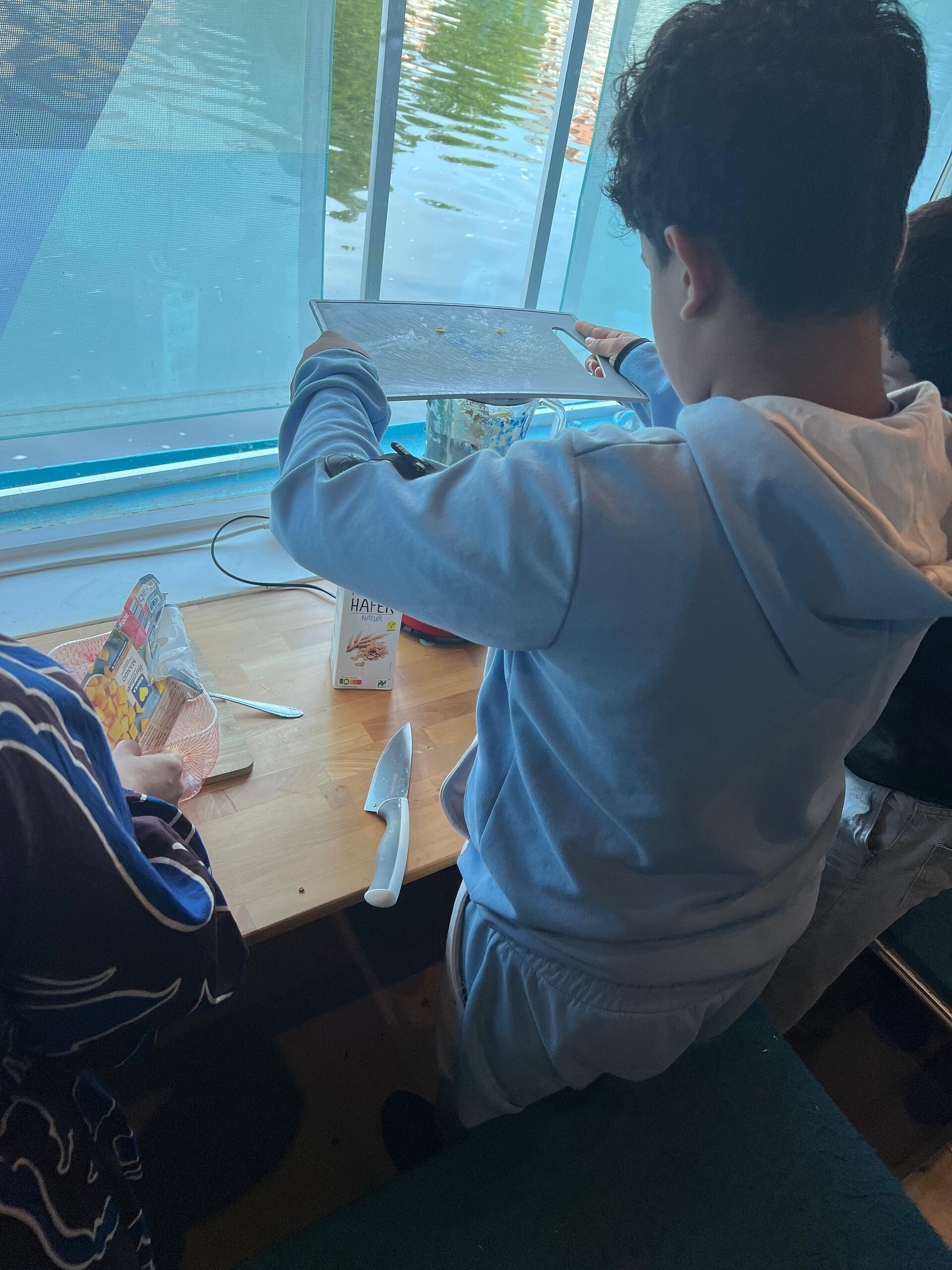 Am 9.9.25 besuchte uns eine 8. Klasse der Gesamtschule Kastanienallee an Bord. Nach dem Keschern und Mikroskopieren, im ersten Teil des Projekttages, waren alle hungrig. Um den Hunger zu stillen, wurde die Kombüse gefordert. Mit Algenfarbstoffen färbten wir in der Algenkombüse zussammen mit den Schüler*innen Waffeln und selbstgemachten Früchtesmoothie blau ein.