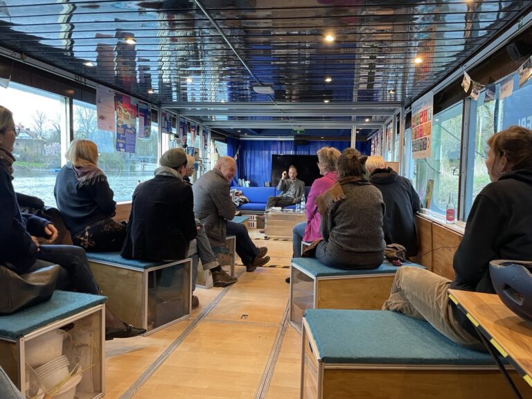 Zur Leipziger Buchmesse finden jedes Jahr auch in Halle (Saale) Lesungen statt unter dem Motto „Halle liest mit“. Auch dieses Jahr luden wir uns wieder jemanden aufs Leseschiff ein. Conrad Kunze, ehemaliger Hallenser, Soziologe und Klimaaktivist, stellte sein Buch „Deutschland als Autobahn – Eine Kulturgeschichte von Männlichkeit, Moderne und Nationalismus“ vor, las einzelne Passagen zu der Geschichte der Autobahn in Deutschland und Europa und berichtete von aktuellen Mobilitätsvorhaben in Halle (Saale) und anderen Städten. Anschließend fand eine angeregte Diskussion zum Thema Verkehr statt und die Gäste hatten noch die Möglichkeit sich eine künstlerische Auseinandersetzung mit der Autobahn in Form eines Hörspiels von Julia Ohlendorf und Caroline Böttcher anzuhören.