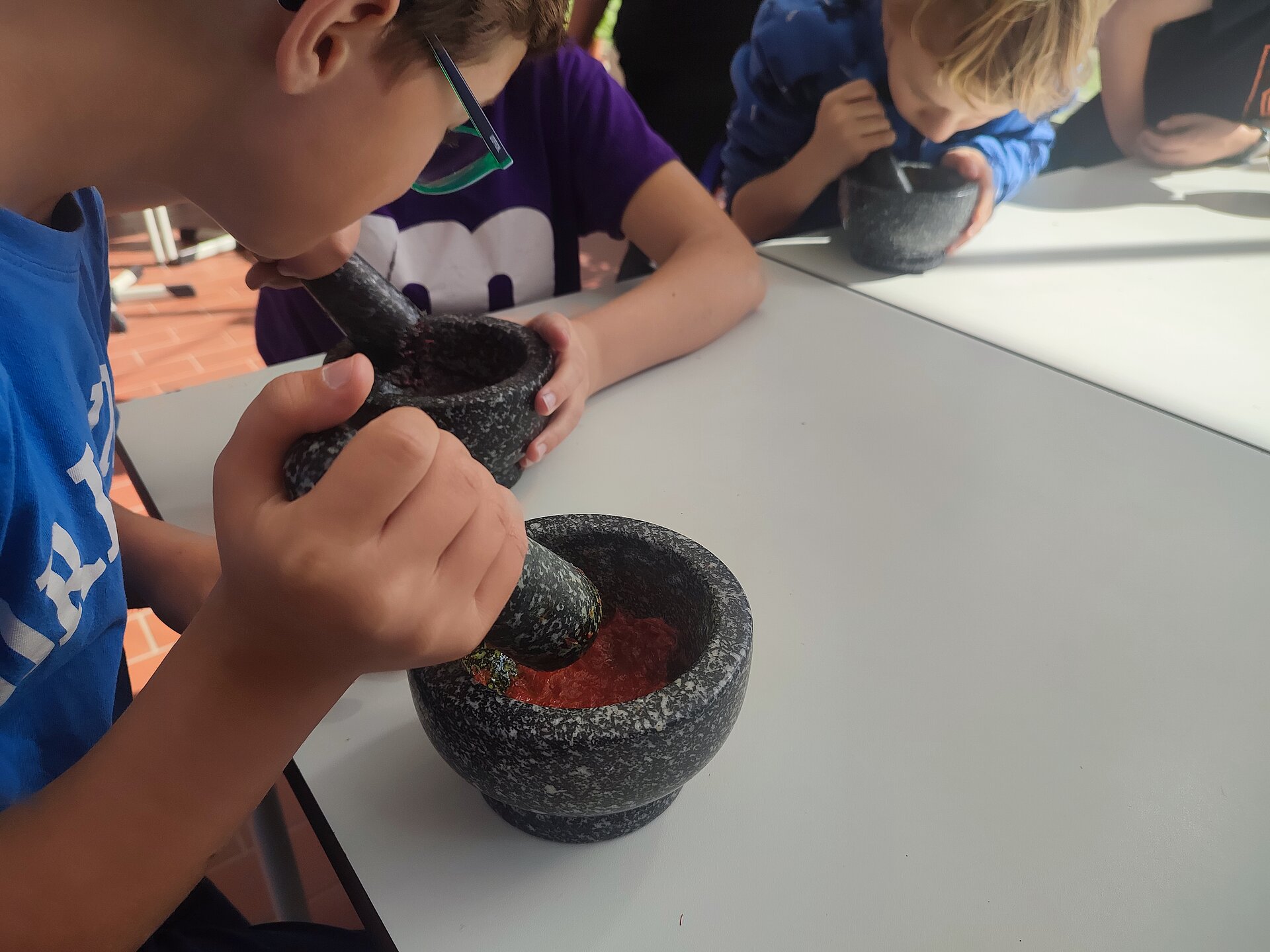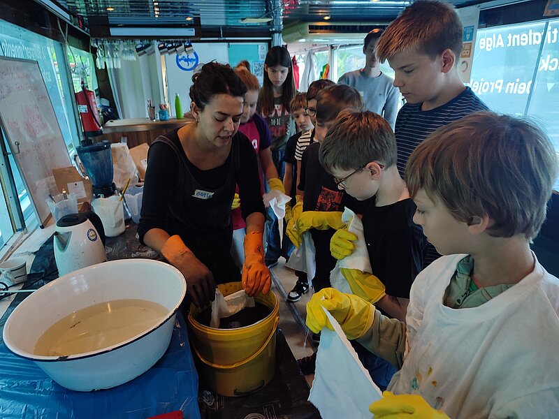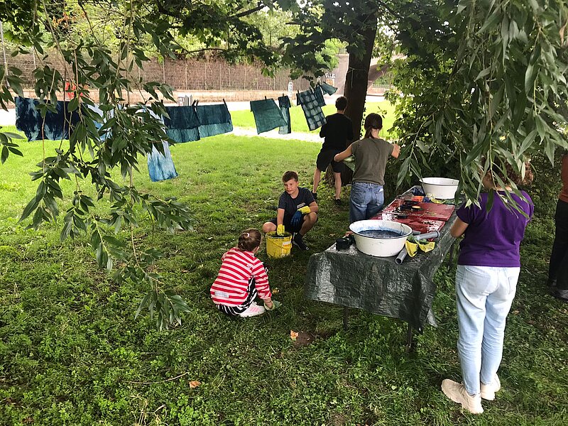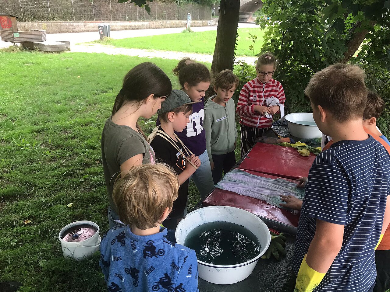 Die Künstlerin Giulia Cabassi leitete den Workshop und gab den Teilnehmer*innen einen spannenden Einstieg in das Thema. Im Anschluss wurde es direkt praktisch: Die Kinder stellten gemeinsam Indigo-Farbe her und fertigten erste Textilproben an.