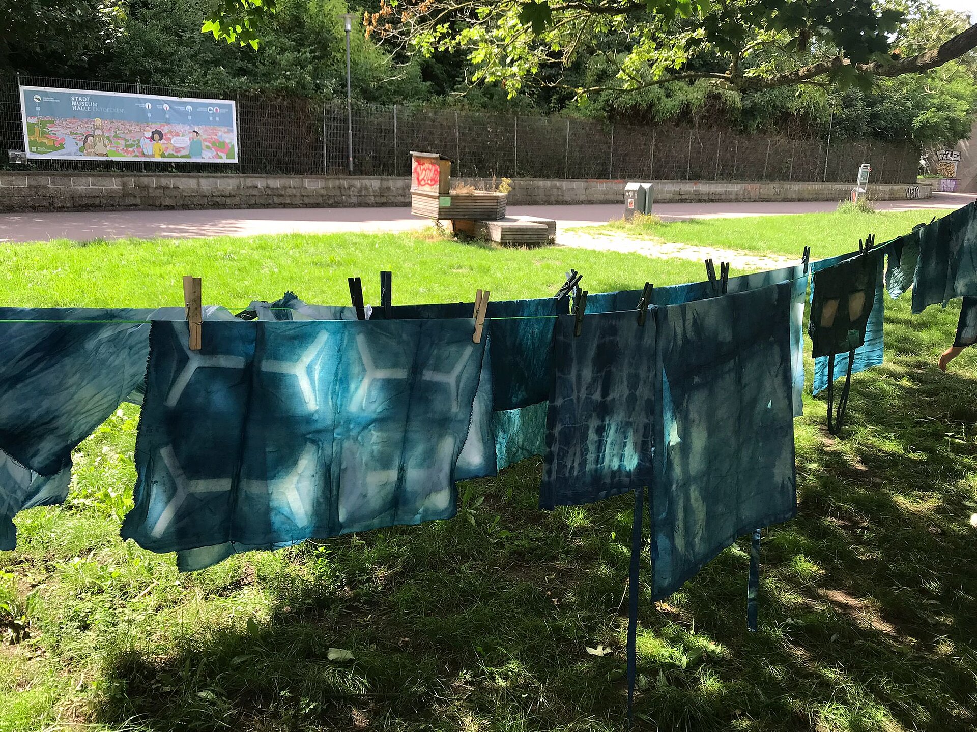 Durch die vielfältigen Shibori-Falt- und Nähtechniken lernten die Teilnehmer*innen, ganz individuelle Muster zum Färben zu gestalten. Diese Werke wurden dann am Mittwochnachmittag in den Bäumen vor der Make Science auf Wäscheleinen getrocknet – sehr zur Freude und Neugier vieler Passant*innen.