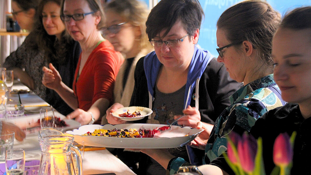 Doch das Dinner4Democracy wäre nicht das Dinner4Democracy ohne ein Prinzip, das zum Nachdenken anregt: Es musste geteilt werden. Einige Gäste erhielten zunächst leere Teller, andere größere Portionen. Schnell wurde das Prinzip klar und das Essen wanderte über den Tisch, wurde aufgeteilt und gemeinsam genossen.