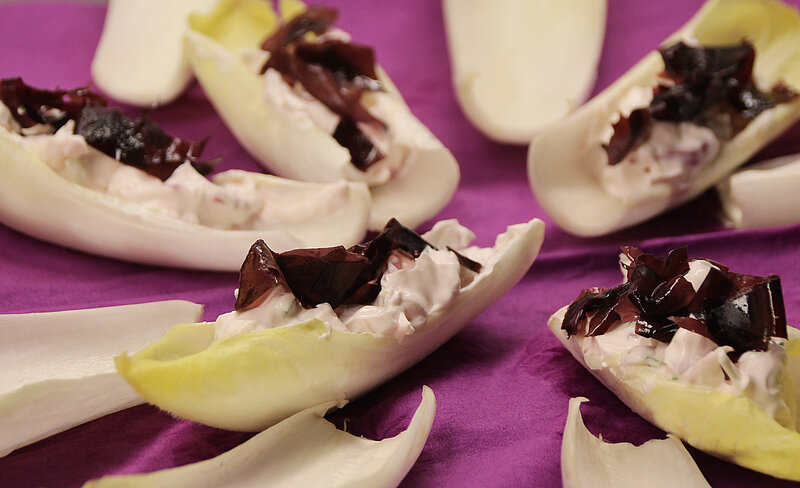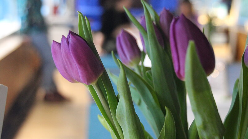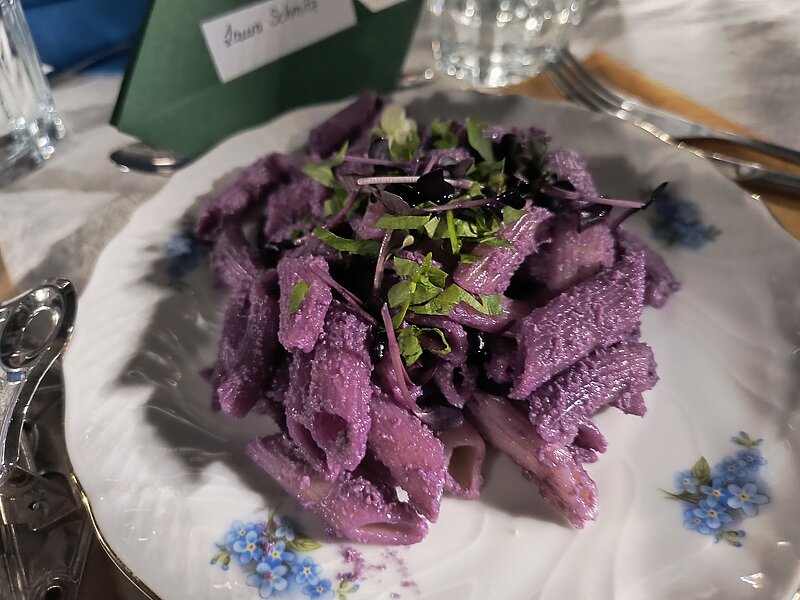 Zur Ausstellung ist zudem ein Magazin entstanden – schwarze Schrift auf lila im Design. Dieses Farbkonzept zog sich wie ein roter Faden durch den gesamten Abend: Das Team war passend gekleidet, lila Tulpen schmückten den Tisch und auch das Menü griff die Farbwelt kreativ auf. Serviert wurden unter anderem Rote-Bete-Salat, Dulsa-Alge und Radieschencreme sowie Heidelbeerjoghurt mit lila Blüte. Ein besonderes Highlight war das Rotkohl-Pesto, das sich durch die Zugabe von Zitrone – angelehnt an den Strukturwandel – farblich veränderte. Alle Speisen waren vegan.